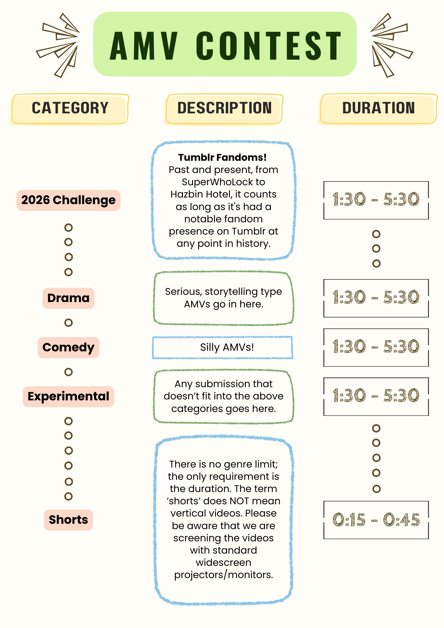 To compete in the AMV Contest, any AMV entered will need to be assigned an appropriate category. Videos compete for the top spot within their specific category. Category themes are broad, typically referring to genre, with the exception of the Challenge category, which is specific and changes every year for the sake of freshness. For our debut year, this category is Tumblr Fandoms! (What else could it possibly be?)
