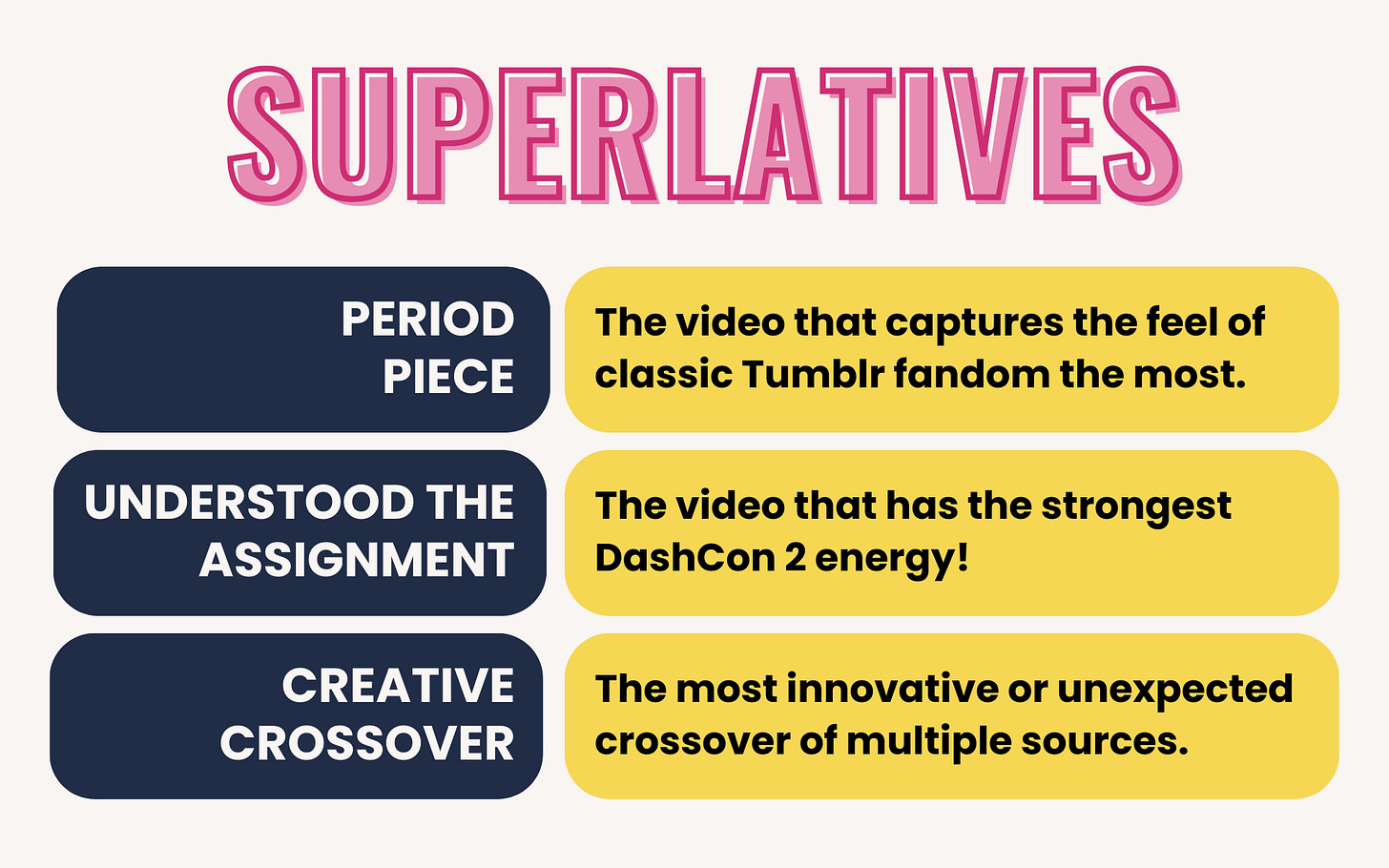 Categories (e.g. 2026 Challenge) and suplerlatives (e.g. Period Piece) will have only one winner each.