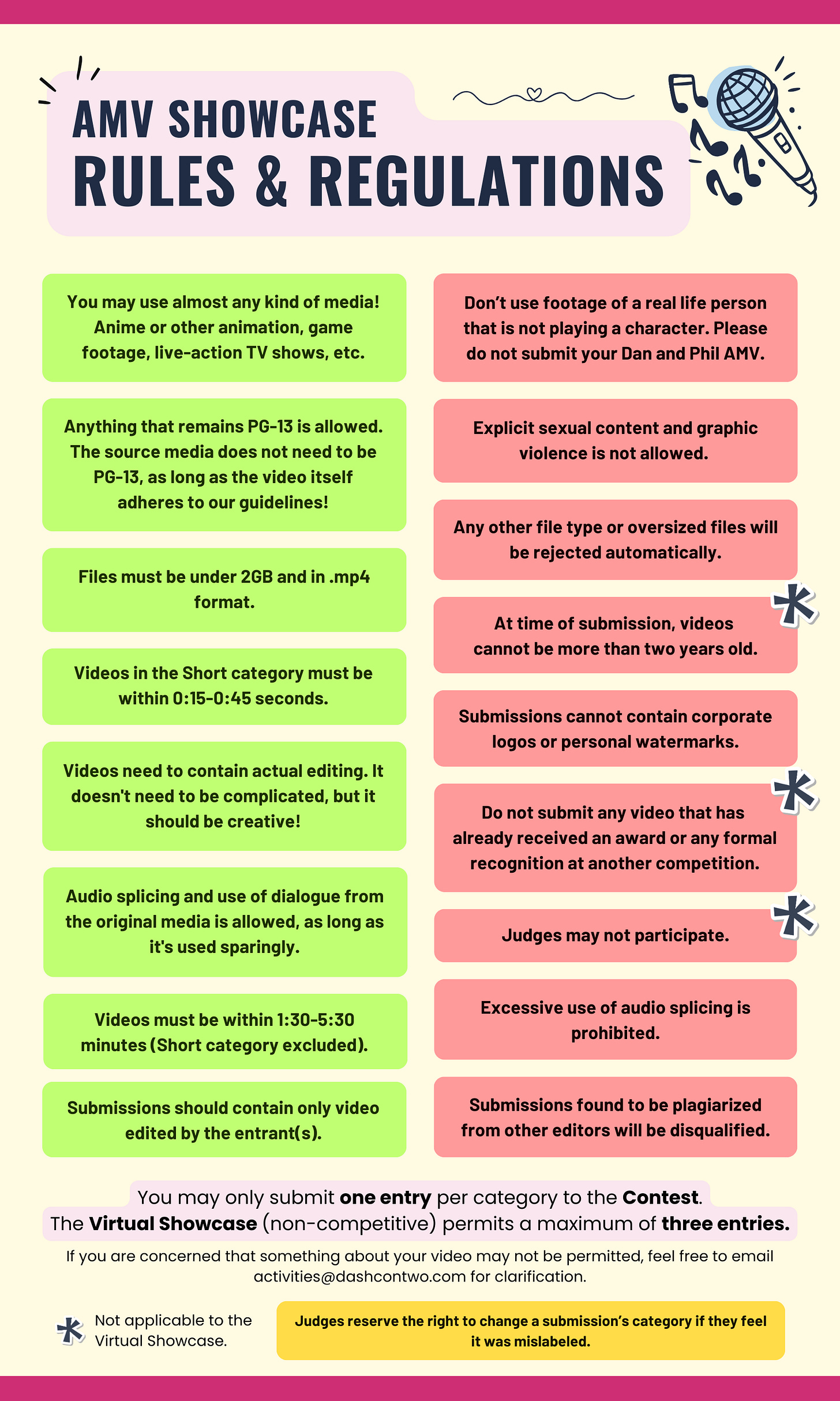 Entrants can submit a maximum of three videos to the Contest and the Virtual Showcase respectively (therefore six videos total for the entirety of the AMV Showcase).